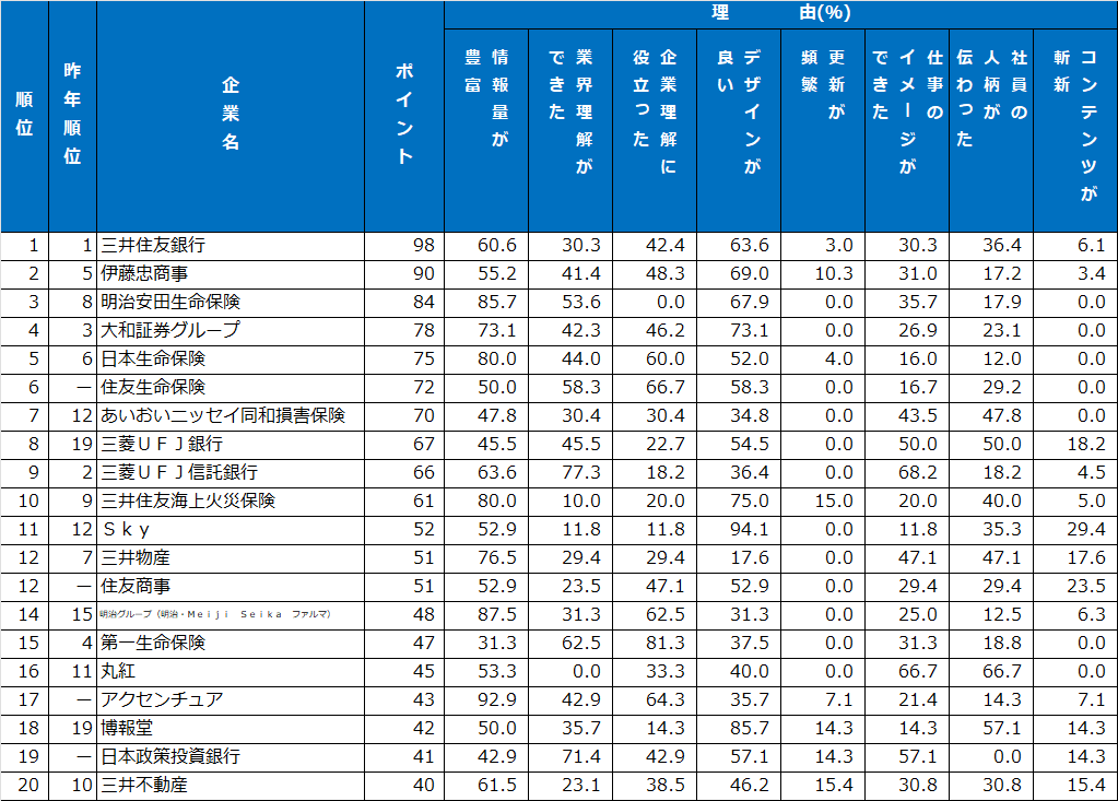3年連続の1位となった三井住友銀行は、「きれいなデザインで、コース別採用の説明が分かりやすかった」「社員インタビューが多様で将来のキャリアを想像できた」と「デザインが良い」「情報量が豊富」で評価されました。2位の伊藤忠商事も「洗練されたデザイン。インターンシップから本選考までさまざまな内容が網羅されていて、幅広い領域の中で具体的にどのように活躍できるか理解できた」と「デザインが良い」「情報量が豊富」で支持されています。