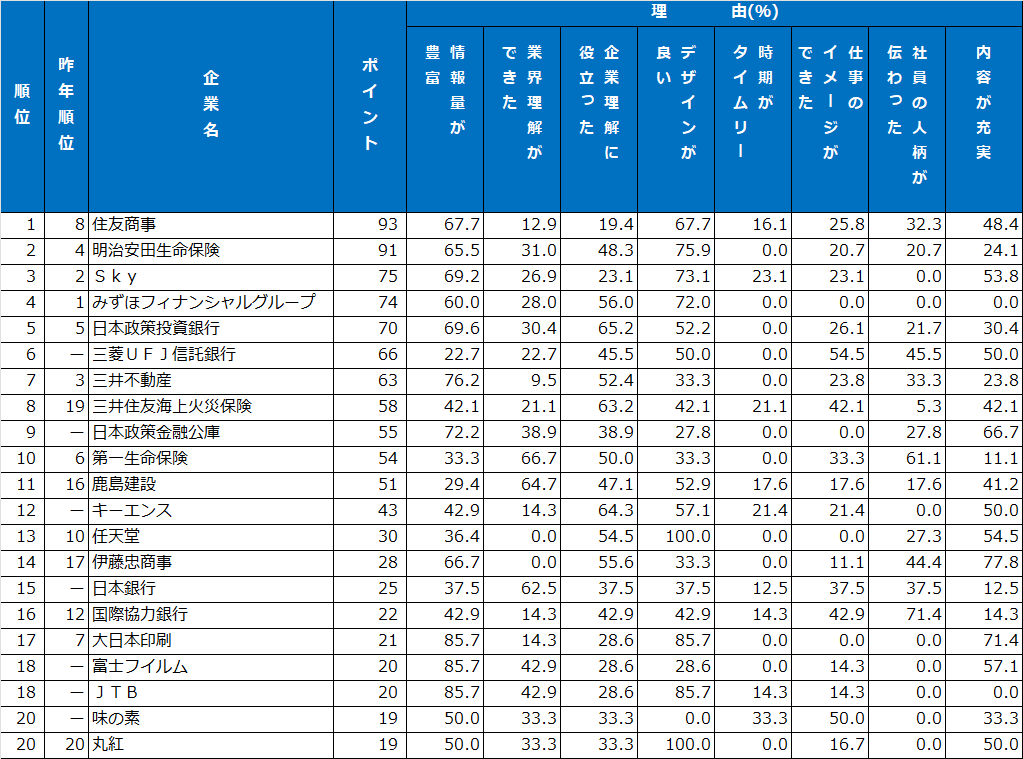 1位の住友商事は「デザインが良かった。オフィスの写真やさまざまな年代の社員の方へのインタビューなど内容も充実していた」と「デザイン」と「情報量」が高く評価されています。2位の明治安田生命保険は「読みやすく、実際の仕事や経営理念などコンパクトに情報が詰まっていた」と「デザイン」に加えて「情報量」でも支持されました。両社共に「自宅に冊子を郵送してくれた」といったコメントも寄せられており、丁寧な情報発信姿勢も学生の琴線に触れたようです。3位のSkyも「デザイン」に加え「企業や製品の紹介、今後の展望などが充実しており企業の目指す方向性などを理解できた」と「情報量」でも評価を集めました。