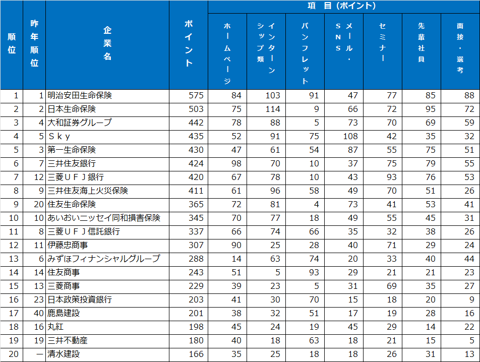 3年連続で総合1位となった明治安田生命保険は、選考・面接部門で1位となったほか、インターンシップ類、パンフレット・入社案内、セミナー・説明会、先輩社員・懇談会の4部門で2位、ホームページで3位とバランスよく学生の支持を集めました。2位の日本生命保険もインターンシップ類、先輩社員・懇談会部門で1位となったほか、選考・面接部門で2位、セミナー・説明会部門で4位、ホームページ、メール・SNSで5位にランクイン。3位の大和証券グループもメール・SNS、面接・選考で3位、ホームページで4位、インターンシップ類で5位と就職活動全般を通して複数の部門で学生の評価を集めた企業が上位にランクインしました。