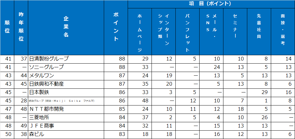 『新卒採用力ランキング』調査では、企業の採用広報、選考活動を(1)ホームページ (2)インターンシップ類 (3)パンフレット・入社案内 (4)メール・SNS (5)セミナー・説明会 (6)先輩社員・懇談会 (7)選考・面接 の7つの分野ごとに学生の評価を聞いています。そして、各分野のポイント合計を企業の「新卒採用力」と定義し、総合ランキングを出しています。